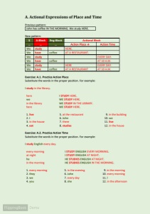 A. Actional Expressions of Place and Time Previous pattern: John has coffee IN THE MORNING. We study HERE. New pattern: S A-Block Rng-Block Actional Block … … … Action Place → Action Time We study HERE. We have coffee AT A RESTAURANT. We study EVERY DAY. We have coffee AT 10 A.M. We study HERE EVERY DAY. We have coffee AT A RESTAURANT AT 10 A.M. Exercise: A.1. Practice Action Place Substitute the words in the proper position. For example: I study in the library. here I STUDY HERE. we WE STUDY HERE. in the library WE STUDY IN THE LIBRARY. here WE STUDY HERE. 1. live 5. at the restaurant 9. in the building 2. I 6. John 10. we 3. in the house 7. there 11. live 4. eat 8. studies 12. in the house Exercise: A.2. Practice Action Time Substitute the words in the proper position. For example: I study English every day. every morning I STUDY ENGLISH EVERY MORNING. at night I STUDY ENGLISH AT NIGHT. he HE STUDIES ENGLISH AT NIGHT. in the morning HE STUDIES ENGLISH IN THE MORNING. 1. every morning 5. in the evening 9. in the morning 2. they 6. John 10. every morning 3. we 7. every day 11. l 4. you 8. she 12. in the afternoon