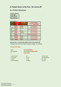 B. Simple States in the Past - the Action BE B.1. Positive Statements Previous pattern: I AM right. John IS tired. We ARE busy. New pattern: S A-Block PrtY-Block Actional Block … BE … … Action Time I WAS right YESTERDAY. John WAS tired YESTERDAY. He WAS here LAST NIGHT. Mary WAS busy YESTERDAY. She WAS sleepy LAST NIGHT. It WAS here YESTERDAY. We WERE busy LAST NIGHT. You WERE right LAST NIGHT. They WERE busy YESTERDAY. Exercise: B.1.1. Practice Past Action Forms of the Action BE Substitute the words and make necessary changes. For example: The boys were busy . Peter PETER WAS BUSY . the students THE STUDENTS WERE BUSY . I I WAS BUSY . 1. the teacher 5. I 9. the class 2. the boys 6. you 10. the doctor 3. John 7. we 11. they 4. the students 8. Mary 12. you