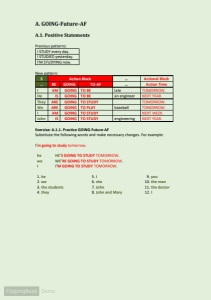 A. GOING-Future-AF A.1. Positive Statements Previous patterns: I STUDY every day. I STUDIED yesterday. I'M STUDYING now. New pattern: S Action Block … Actional Block … BE GOING TO-AF … Action Time I AM GOING TO BE late TOMORROW. He IS GOING TO BE an engineer NEXT YEAR. They ARE GOING TO STUDY TOMORROW. We ARE GOING TO PLAY baseball TOMORROW. I AM GOING TO STUDY NEXT WEEK. John IS GOING TO STUDY engineering NEXT YEAR. Exercise: A.1.1. Practice GOING-Future-AF Substitute the following words and make necessary changes. For example: I ’ m going to study tomorrow. he HE ’ S GOING TO STUDY TOMORROW. we WE ’ RE GOING TO STUDY TOMORROW. I I ’ M GOING TO STUDY TOMORROW. 1. he 5. I 9. you 2. we 6. she 10. the man 3. the students 7. John 11. the doctor 4. they 8. John and Mary 12. I