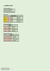 C. SOME & ANY Previous patterns: Do you need A BOOK? I need two BOOKS. I don't like HOT LIQUORS. Questions: … SOME/ANY … Do you need ANY fruit ? Do you need SOME bread ? Do you need SOME paperclips ? Do you need ANY books ? Positive statements: … SOME … I need SOME bread . I need SOME fruit . I need SOME paperclips . I need SOME books . Negative statements: … ANY … I don't need ANY bread . I don't need ANY fruit . I don't need ANY paperclips . I don't need ANY books .