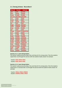 A.1. Strong Actions - Recordset I Base-AF Past-AF Have-AF eat ATE EATEN give GAVE GIVEN come CAME COME become BECAME BECOME run RAN RUN meet MET MET read READ READ sit SAT SAT begin BEGAN BEGUN drink DRANK DRUNK sing SANG SUNG get GOT GOT forget FORGOT FORGOTTEN see SAW SEEN tear TORE TORN wear WORE WORN speak SPOKE SPOKEN break BROKE BROKEN wake WOKE WOKEN write WROTE WRITTEN ride RODE RIDDEN choose CHOSE CHOSEN take TOOK TAKEN fall FELL FALLEN know KNEW KNOWN Exercise: A.1.1. Learn Strong Actions The teacher loudly pronounces Base, Past, and Have-AF of a strong action. Then the students repeat them. Go through this exercise with the students' books closed. For example: Teacher: READ , READ , READ Student: READ , READ , READ Exercise: A.1.2. Learn Strong Actions The teacher loudly pronounces Base, Past, and Have-AF of a strong action. Then the students repeat them in reversed order. Go through this exercise with the students' books closed. For example: Teacher: SPEAK , SPOKE , SPOKEN Student: SPOKEN , SPOKE , SPEAK