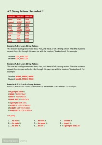 A.2. Strong Actions - Recordset II Base-AF Past-AF Have-AF send SENT SENT spend SPENT SPENT lend LENT LENT lose LOST LOST make MADE MADE have HAD HAD cut CUT CUT put PUT PUT cost COST COST Exercise: A.2.1. Learn Strong Actions The teacher loudly pronounces Base, Past, and Have-AF of a strong action. Then the students repeat them. Go through this exercise with the students' books closed. For example: Teacher: CUT , CUT , CUT Student: CUT , CUT , CUT Exercise: A.2.2. Learn Strong Actions The teacher loudly pronounces Base, Past, and Have-AF of a strong action. Then the students repeat them in reversed order. Go through this exercise with the students' books closed. For example: Teacher: MAKE , MADE , MADE Student: MADE , MADE , MAKE Exercise: A.2.3. Practice Strong Actions Produce statements related to EVERY DAY, YESTERDAY and ALREADY. For example: I ' m going to send it . I SEND IT EVERY DAY. I SENT IT YESTERDAY. I HAVE SENT IT ALREADY. It ' s going to cost a lot. IT COSTS A LOT EVERY DAY. IT COST A LOT YESTERDAY. IT HAS COST A LOT ALREADY. I’ m going … 1. … to lose it . 4. … to have it . 7. … to lend it . 2. … to make it . 5. … to spend it . 8. … to put it . 3. … to send it . 6. … to cut it . 9. It ’ s going to cost $20.