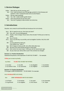 1. Review Dialogue Father: What did you do this morning, son? Son: First, I took my bicycle out of the garage, parked it in the driveway and washed it. Then I mowed the lawn and cut some flowers. Father: Did you make anything? Son: Yes, I did. I made another garden bench. Father: How many benches do we have now? Son: Two, but I'm going to make another one tomorrow. 2. Introductions Situation: Jerry meets his old friend Bill and introduces him to his family. Jerry: Bill, it’s good to see you. How have you been? Bill: Fine, Jerry. You are looking good. Jerry: Thanks, I never change. Do you have a few minutes? I’d like you to meet my family. Bill: Yes, of course. Jerry: This is my wife Kay, my son Billy, and my daughter Caroline. And, this is Bill Jones. Bill: I’m very pleased to meet you. (The children say, “Hello.”) Kay: We’re happy to meet you Bill. Jerry often talks about you. Bill: We were very close friends during our school days. Jerry: Here comes my cousin Joyce. I think you met her several years ago. Bill: Do you mean your skinny little cousin? She certainly has changed. Exercise: 2.1. Practice Introductions Substitute the persons in the expression I’D LIKE YOU TO MEET … . For example: I ' d like you to meet my family . my father I ' D LIKE YOU TO MEET MY FATHER . 1. my sister 3. my wife 5. my daughter 7. my brother 2. my mother-in-law 4. my roommate 6. my neighbor 8. my teacher Exercise: 2.2. Practice Introductions Fill the gap in JERRY INTRODUCED … TO HIS FAMILY. For example: Jerry introduced Bill to his family . him JERRY INTRODUCED HIM TO HIS FAMILY . 1. his friend 3. his teacher 5. his coach 6. his classmate 2. his girlfriend 4. his neighbor 6. Prof. Brown 7. Dr. Taylor