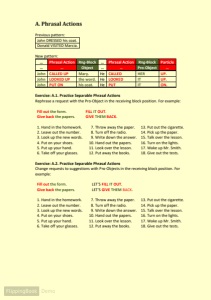 A. Phrasal Actions Previous pattern: John DRESSED his coat. Donald VISITED Marcia. New pattern: … Phrasal Action Rng-Block … Phrasal Action Rng-Block Particle … … Object … … Pro-Object … John CALLED UP Mary. He CALLED HER UP. John LOOKED UP the word. He LOOKED IT UP. John PUT ON his coat. He PUT IT ON. Exercise: A.1. Practice Separable Phrasal Actions Rephrase a request with the Pro-Object in the receiving block position. For example: Fill out the form . FILL IT OUT . Give back the papers . GIVE THEM BACK . 1. Hand in the homework. 7. Throw away the paper. 13. Put out the cigarette. 2. Leave out the number. 8. Turn off the radio. 14. Pick up the paper. 3. Look up the new words. 9. Write down the answer. 15. Talk over the lesson. 4. Put on your shoes. 10. Hand out the papers. 16. Turn on the lights. 5. Put up your hand. 11. Look over the lesson. 17. Wake up Mr. Smith. 6. Take off your glasses. 12. Put away the books. 18. Give out the tests. Exercise: A.2. Practice Separable Phrasal Actions Change requests to suggestions with Pro-Objects in the receiving block position. For example: Fill out the form . LET'S FILL IT OUT . Give back the papers . LET'S GIVE THEM BACK. 1. Hand in the homework. 7. Throw away the paper. 13. Put out the cigarette. 2. Leave out the number. 8. Turn off the radio. 14. Pick up the paper. 3. Look up the new words. 9. Write down the answer. 15. Talk over the lesson. 4. Put on your shoes. 10. Hand out the papers. 16. Turn on the lights. 5. Put up your hand. 11. Look over the lesson. 17. Wake up Mr. Smith. 6. Take off your glasses. 12. Put away the books. 18. Give out the tests.