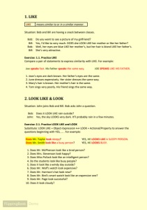 1. LIKE LIKE means similar to or in a similar manner . Situation: Bob and Bill are having a snack between classes. Bob: Do you want to see a picture of my girlfriend? Bill: Yes, I’d like to very much. DOES she LOOK LIKE her mother or like her father? Bob: Well, her eyes are blue LIKE her mother’s, but her hair is blond LIKE her father’s. Bill: She’s very attractive. Exercise: 1.1. Practice LIKE Compare a pair of statements to express similarity with LIKE. For example: Joe speaks fast. His father speaks the same way. JOE SPEAKS LIKE HIS FATHER. 1. Jean's eyes are dark brown. Her father's eyes are the same. 2. June dresses expensively. Her sister dresses the same way. 3. Mary's hair is brown. Her mother's hair is the same. 4. Tom sings very poorly. His friend sings the same way. 2. LOOK LIKE & LOOK Situation: John joins Bob and Bill. Bob asks John a question. Bob: Does it LOOK LIKE rain outside? John: Yes, the sky LOOKS very dark. It’ll probably rain in a few minutes. Exercise: 2.1. Practice LOOK LIKE and LOOK Substitute: LOOK LIKE + Object-Expression ↔ LOOK + Actional/Property to answer the questions beginning with YES, … . For example: Does Mr. Taylor look sleepy? YES, HE LOOKS LIKE A SLEEPY PERSON. Does Mr. Smith look like a busy person? YES, HE LOOKS BUSY. 1. Does Mr. McPherson look like a tired person? 2. Does Mrs. Stevenson look happy? 3. Does Miss Pollack look like an intelligent person? 4. Do the students look like busy people? 5. Does it look like a windy day outside? 6. Does Mr. Wolf's watch look expensive? 7. Does Mr. Harrison's hat look new? 8. Does Mr. Bird's smart watch look like an expensive one? 9. Does Mr. Page look successful? 10. Does it look cloudy?