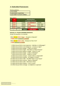 A. Embedded Statements Previous patterns: I know MARY. I asked MARY A QUESTION. I want MARY TO STUDY CHINESE. New pattern: S A Receiving Block … … Embedded Statement I know JOHN IS LOOKING AT MARY. I know MARY SEES MR. KING. I know MARY IS LOOKING AT MR. KING. I know (THAT) JOHN SEES MARY. … … S-Block Action Block Rng-Block Exercise: A.1. Practice Embedded Statements Answer the questions. For example: Which do you think is bigger – Shanghai or Belgrade ? I THINK (THAT) SHANGHAI IS BIGGER . Which do you think is older - Budapest or New York ? I THINK BUDAPEST IS OLDER . 1. Which do you think is more expensive - a Bentley or a Volkswagen? 2. Which do you think is more dangerous - a mouse or a tiger? 3. Which do you think is deeper - a lake or an ocean? 4. Which do you think is higher - Mont Blanc or Mount Everest? 5. Which do you think is lighter in weight - a horse or a cat? 6. Which do you think is longer - a mile or a kilometer? 7. Which do you think is faster - a rabbit or a turtle? 8. Which do you think is sharper - a butter knife or a steak knife? 9. Which do you think is sweeter - an orange or a lemon? 10. Which do you think is taller - the Eiffel Tower or your house? 11. Which do you think is warmer - Miami or Moscow? 12. Which do you think is older - Montreal or Paris? 13. Which do you think is heavier - a car or a train? 14. Which do you think is stronger - an elephant or a sparrow?