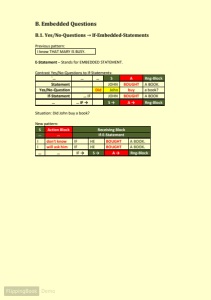 B. Embedded Questions B.1. Yes/No-Questions → If-Embedded-Statements Previous pattern: I know THAT MARY IS BUSY. E-Statement – Stands for EMBEDDED STATEMENT. Contrast Yes/No-Questions to If-Statements: `… … … S A Rng-Block Statement JOHN BOUGHT A BOOK. Yes/No-Question Did John buy a book? If-Statement … IF JOHN BOUGHT A BOOK … … IF → S → A → Rng-Block Situation: Did John buy a book? New pattern: S Action Block Receiving Block … … If-E-Statement I don't know IF HE BOUGHT A BOOK. I will ask him IF HE BOUGHT A BOOK. … … IF → S → A → Rng-Block