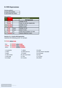 D. WH-Expressions Previous pattern: I knew THE LESSON. I told THEM THE STORY. New pattern: S A Receiving Block … … … Wh-Expression I know WHERE TO GO. I know HOW TO USE MY COMPUTER. We decided WHERE TO GO. We decided WHAT TO DO. I told them WHERE TO GO. I told them WHAT TO DO. He told us HOW MUCH MONEY TO TAKE. He advised us WHICH PRINTER TO BUY. Exercise: D.1. Practice Wh-Expressions Substitute the following words. For example: He knows where to go . how HE KNOWS HOW TO GO . to drive HE KNOWS HOW TO DRIVE . where HE KNOWS WHERE TO DRIVE . 1. to practice 7. where 13. what 2. when 8. please tell me 14. they haven't decided 3. what 9. to park 15. he knows 4. I don't know 10. you must know 16. how 5. how long 11. how 17. to drive 6. to sleep 12. to write 18. where
