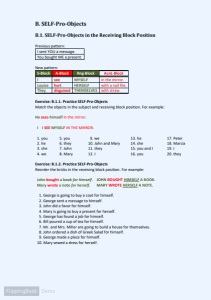 B. SELF-Pro-Objects B.1. SELF-Pro-Objects in the Receiving Block Position Previous pattern: I sent YOU a message. You bought ME a present. New pattern: S-Block A-Block Rng-Block AcnL-Block I see MYSELF in the mirror. Louise hurt HERSELF with a nail file. They disguised THEMSELVES with straw. Exercise: B.1.1. Practice SELF-Pro-Objects Match the objects in the subject and receiving block position. For example: He sees himself in the mirror. I I SEE MYSELF IN THE MIRROR. 1. you 5. you 9. we 13. he 17. Peter 2. he 6. they 10. John and Mary 14. she 18. Marcia 3. she 7. John 11. they 15. you and I 19. I 4. we 8. Mary 12. I 16. you 20. they Exercise: B.1.2. Practice SELF-Pro-Objects Reorder the bricks in the receiving block position. For example: John bought a book for himself . JOHN BOUGHT HIMSELF A BOOK . Mary wrote a note for herself . MARY WROTE HERSELF A NOTE . 1. George is going to buy a coat for himself. 2. George sent a message to himself. 3. John did a favor for himself. 4. Mary is going to buy a present for herself. 5. George has found a job for himself. 6. Bill poured a cup of tea for himself. 7. Mr. and Mrs. Miller are going to build a house for themselves. 8. John ordered a dish of Greek Salad for himself. 9. George made a place for himself. 10. Mary sewed a dress for herself.